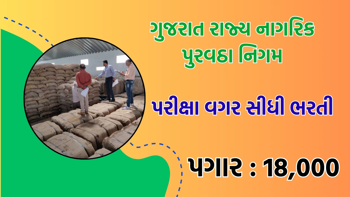 ગુજરાત સરકાર દ્વારા ગુજરાત રાજ્ય નાગરિક પુરવઠા નિગમ લિમિટેડ ભરતી જાહેર કરવામાં આવી છે જેમાં ડિપ્લોમા અને સ્નાતક ઉમેદવારો ફોર્મ ભરી શકશે જે ઉમેદવાર પરીક્ષામાં પાસ થશે તેમનો 18000 પગાર આપવામાં આવશે અને ડિપ્લોમા ઉમેદવાર માટે તમને પગાર રૂ.15,000/- આપવામાં આવશે.